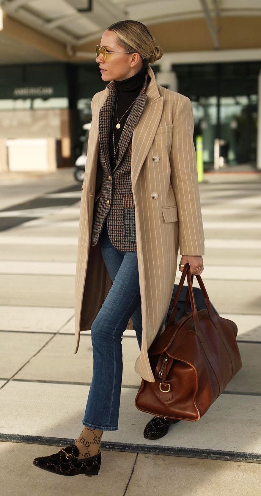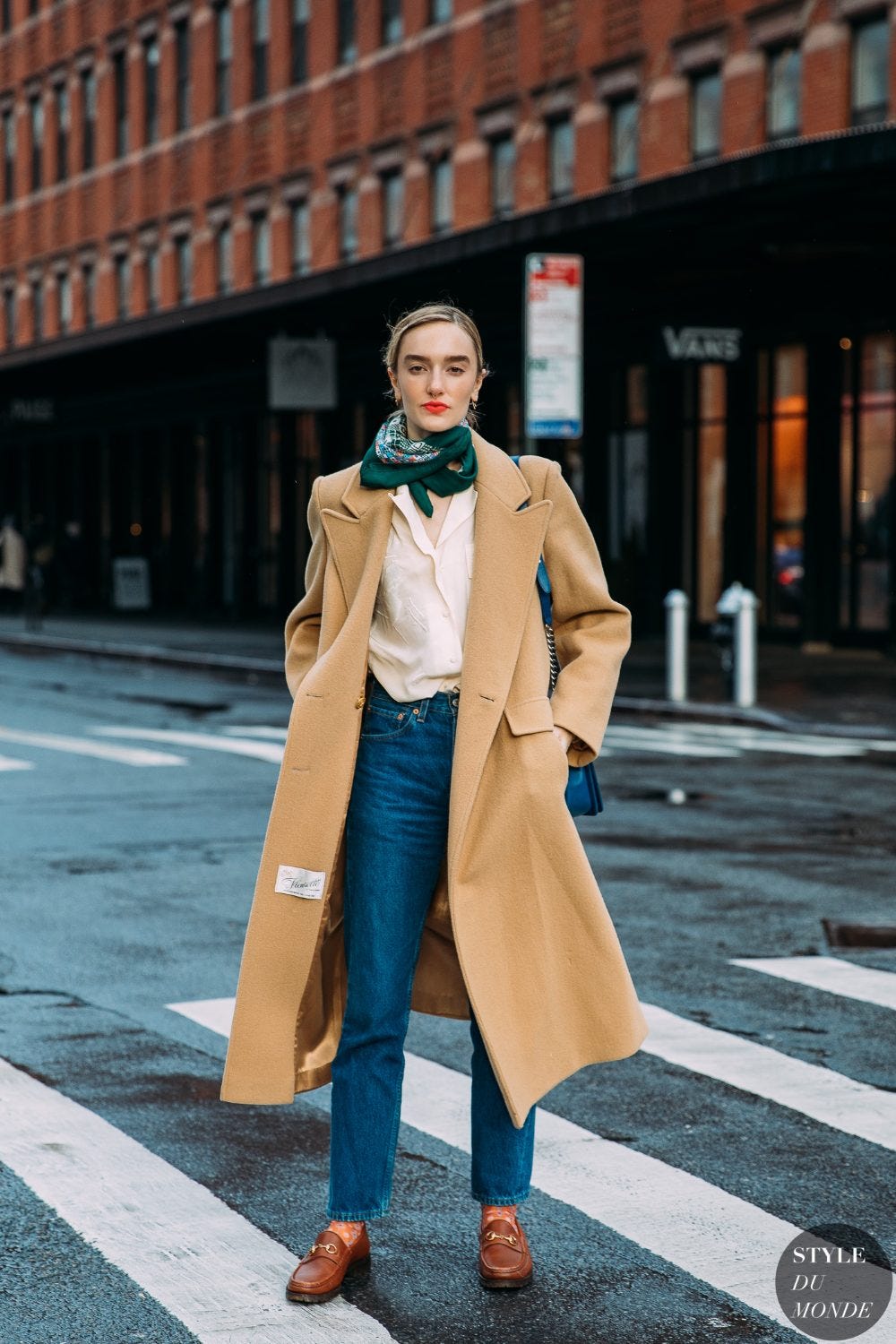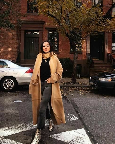 The classic jeans, loafers and camel coat combo:
