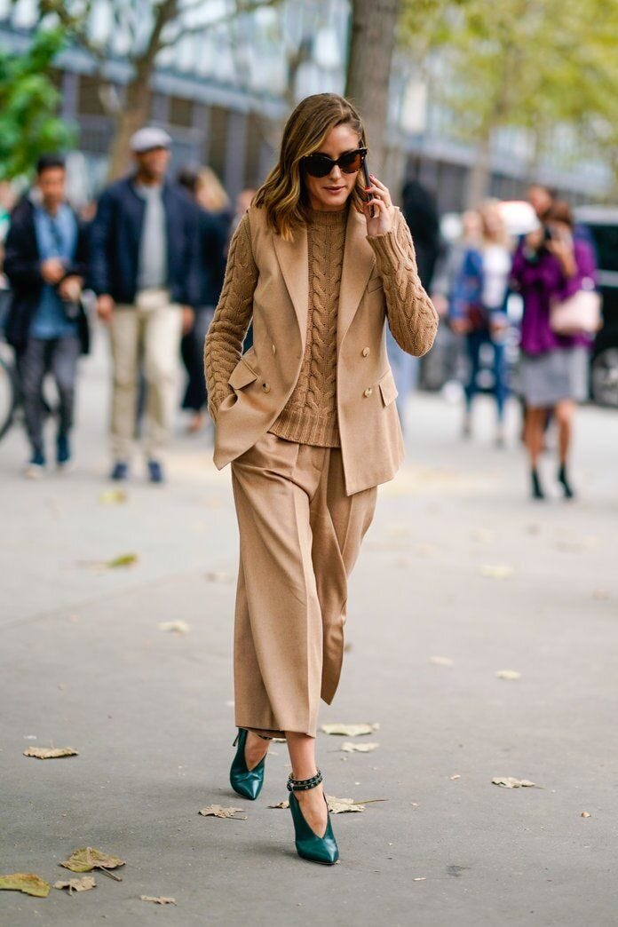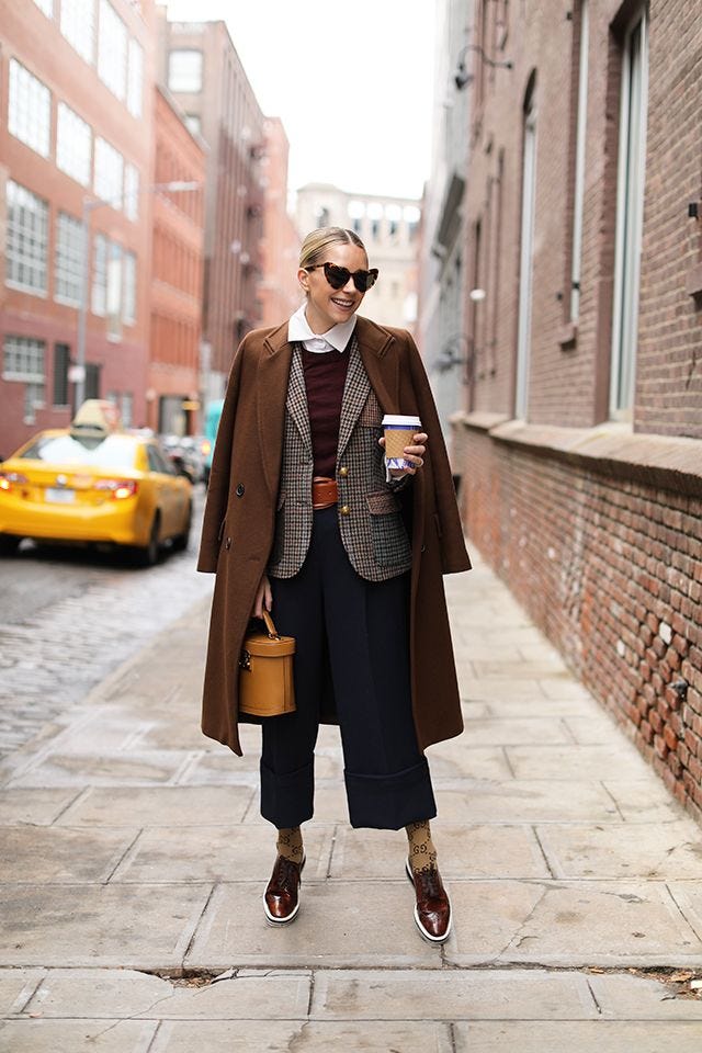 Even if you're working from home this fall, you can't ever go wrong with a wide-leg trouser. On days when you're feeling freedom over form, a chunky knit is the perfect topper to your fashionable sack-like slacks. Accessorize with a vest or coat, and either sneaks, pumps or booties for a finishing touch.